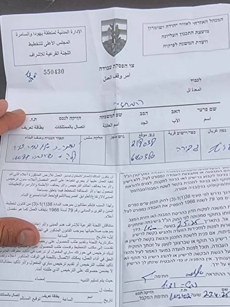 القدس 28-4-2025 وفا- سلّمت قوات الاحتلال الإسرائيلي، اليوم الاثنين، إخطارات بوقف البناء في بلدة الجيب شمال مدينة القدس المحتلة.