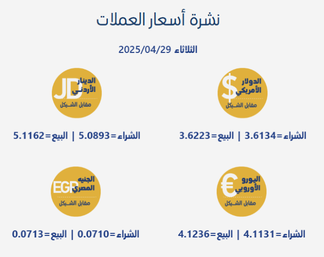 رام الله 29-4-2025 وفا- جاءت أسعار صرف العملات مقابل الشيقل الإسرائيلي، اليوم الثلاثاء، بحسب سلطة النقد الفلسطينية، على النحو التالي: