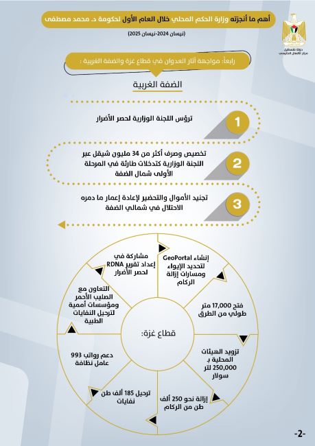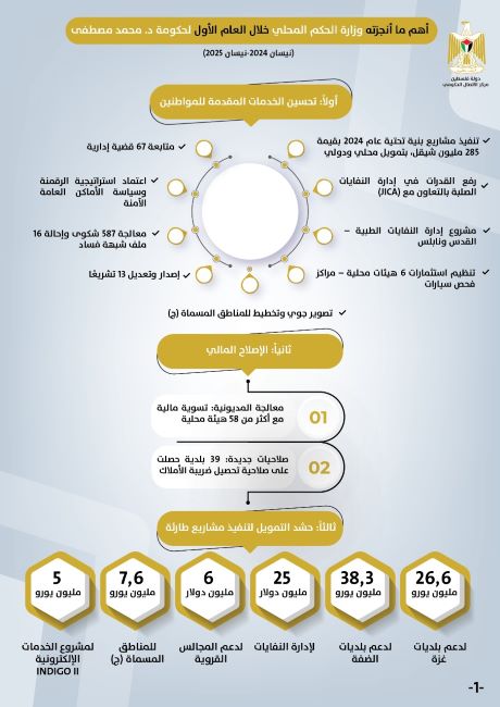 رام الله 29-4-2025 وفا- استعرض مركز الاتصال الحكومي في تقرير مبني على بيانات وزارة الحكم المحلي، أهم الإنجازات التي حققتها الوزارة خلال عام من تولي الحكومة مهامها في نيسان 2024 إلى نيسان 2025، وشملت تحسين الخدمات المقدمة للمواطنين، وتعزيز البنية التحتية، والإصلاح المالي، وحشد التمويل لمشاريع طارئة، إضافة إلى مواجهة آثار العدوان الإسرائيلي على قطاع غزة والمحافظات الشمالية.