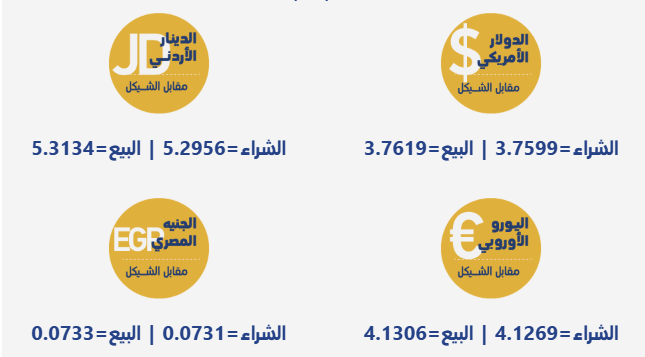 رام الله 8-4-2025 وفا- جاءت أسعار صرف العملات مقابل الشيقل الإسرائيلي، اليوم الثلاثاء، بحسب سلطة النقد الفلسطينية، على النحو التالي: