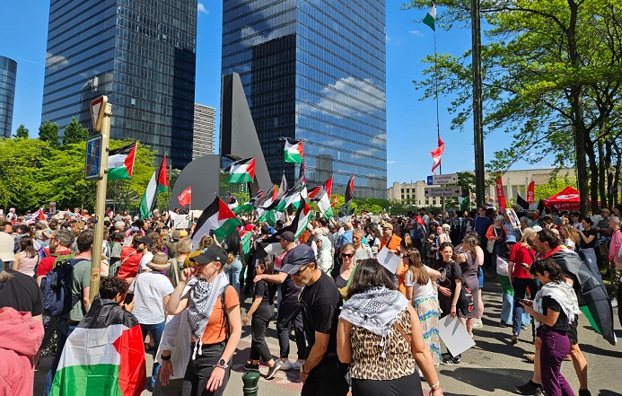 بروكسل 11-5-2025 وفا- شهدت العاصمة البلجيكية بروكسل، اليوم الأحد، مظاهرة حاشدة شارك فيها أكثر من 80 ألف شخص من أبناء الجاليات الفلسطينية والعربية والنشطاء والمتضامنين مع الشعب الفلسطيني، تنديدا باستمرار العدوان الإسرائيلي على قطاع غزة.
