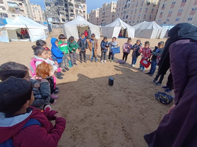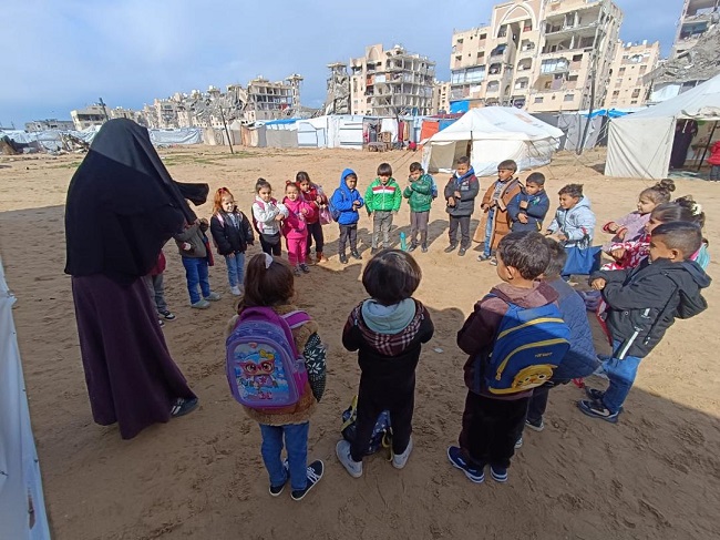 بين أنقاض الأبراج المدمرة في مدينة حمد غرب محافظة خان يونس، حيث لا ظلّ إلا لخراب الحرب ورائحة البارود، وحرارة الشمس تصهر البلاستيك الذي يعلو الخيام، هناك مدرسة تُدعى "إشراقة أمل". لم تولد من بنية تحتية جاهزة، بل من إرادة أناس قرروا أن يزرعوا العلم في أرضٍ غطاها الرماد.