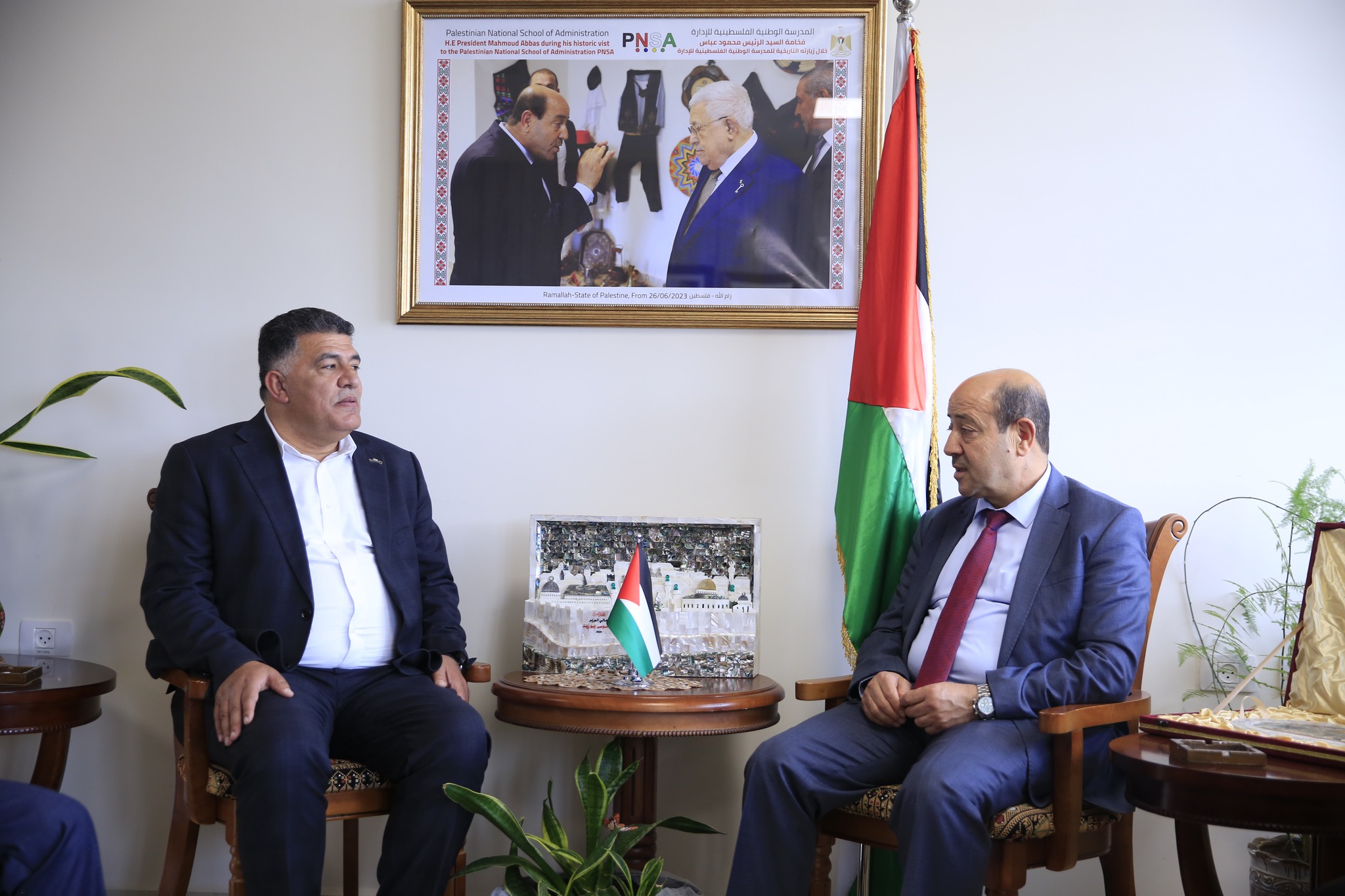 رام الله 13-5-2025 وفا- أطلع رئيس ديوان الموظفين العام، رئيس مجلس إدارة المدرسة الوطنية الفلسطينية للإدارة الوزير موسى أبو زيد، اليوم الثلاثاء، محافظ نابلس غسان دغلس ونائبه العقيد عبد الله العسالي، على برامج وعمل المدرسة الوطنية.