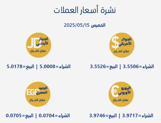 رام الله 15-5-2025 وفا- جاءت أسعار صرف العملات مقابل الشيقل الإسرائيلي، اليوم الخميس، بحسب سلطة النقد الفلسطينية، على النحو التالي: