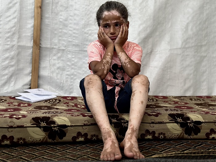 فلم ينجح القميص الوردي الذي ترتديه الشريف وطبع عليه شخصية "ميكي ماوس" الكرتونية في إضفاء قليل من الفرحة على ملامحها التي بدت مثقلة بالحزن بعدما وُشم جسدها بندوب بيضاء أشبه بمرض "البهاق" وفق تقدير أطباء بغزة.