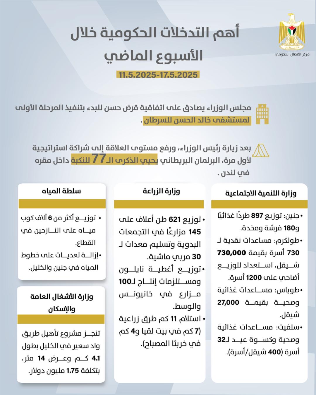 رام الله 18-5-2025 وفا- أصدر مركز الاتصال الحكومي تقريرًا يبرز أهم التدخلات التنموية والإصلاحية التي نَفذَّتها الحكومة، خلال الأسبوع الماضي (11/4/2025 – 17/4/2025).