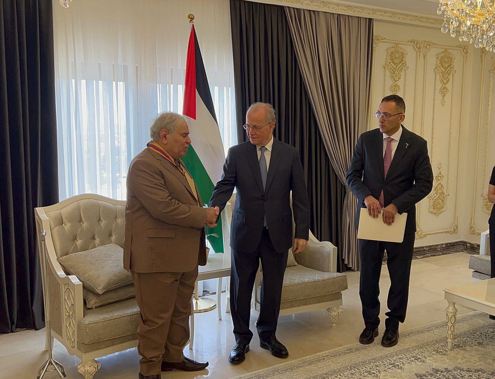 وسلم وسام التكريم نيابة عن الرئيس، رئيس الوزراء وزير الخارجية محمد مصطفى، بحضور سفير دولة فلسطين لدى العراق احمد الرويضي.