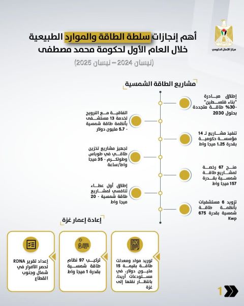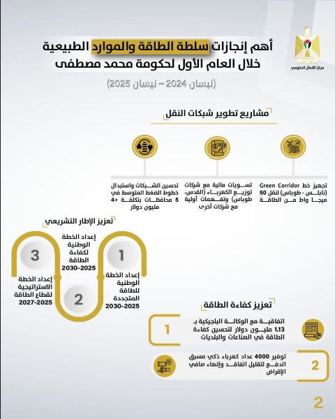 رام الله 22-5-2025 وفا- أصدر مركز الاتصال الحكومي تقريرًا يُلخص أبرز إنجازات سلطة الطاقة والموارد الطبيعية خلال العام الأول لحكومة محمد مصطفى (نيسان 2024 – نيسان 2025)، حيث شهد القطاع سلسلة من المشاريع التي تهدف إلى تطوير البنية التحتية للطاقة، وتعزيز الاعتماد على المصادر المتجددة، وزيادة الكفاءة، في إطار رؤية وطنية للتحول الطاقي المستدام.
