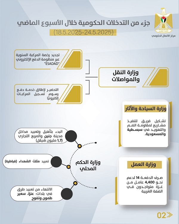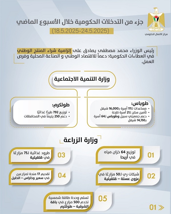 رام الله 25-5-2025 وفا- أصدر مركز الاتصال الحكومي تقريرا يظهر أهم التدخلات التنموية والإصلاحية التي نفذتها الحكومة الفلسطينية، خلال الأسبوع الماضي (18/05/2025 – 24/05/2025)، على النحو الآتي:
