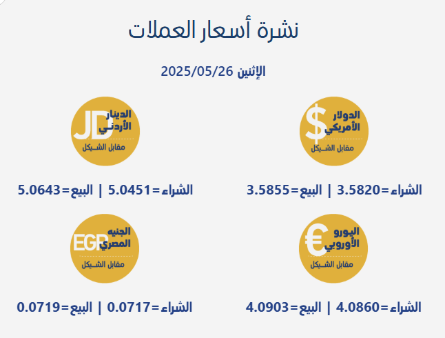 رام الله 26-5-2025 وفا- جاءت أسعار صرف العملات مقابل الشيقل الإسرائيلي، اليوم الإثنين، بحسب سلطة النقد الفلسطينية، على النحو التالي: