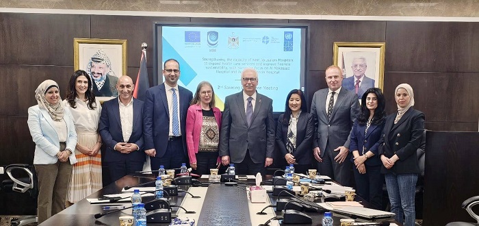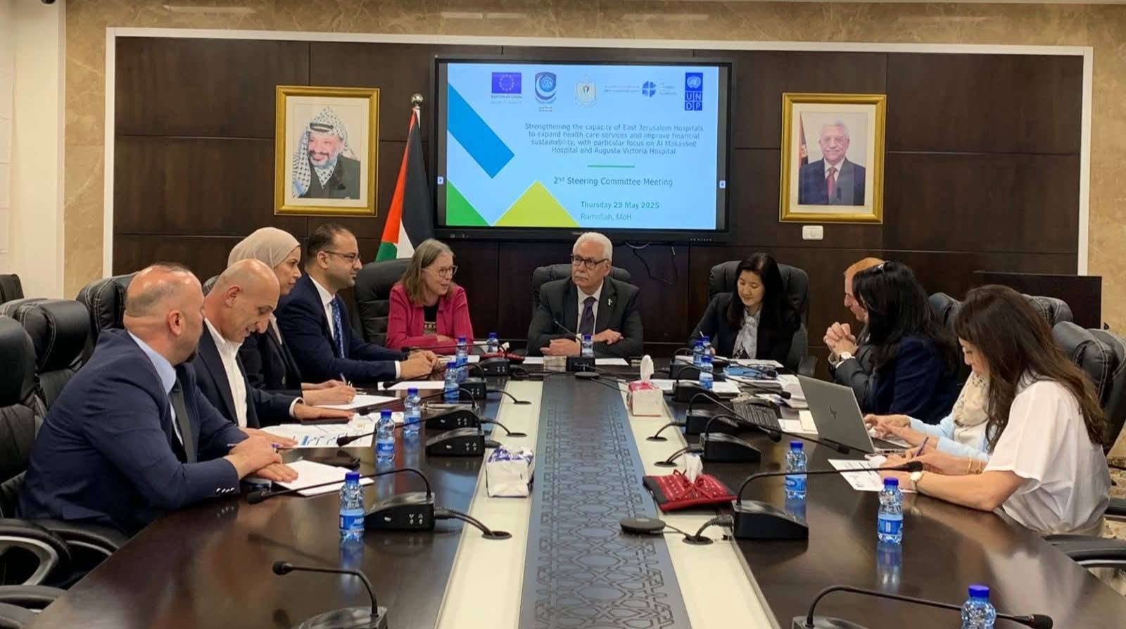 رام الله 29-5-2025 وفا- ترأس وزير الصحة ماجد أبو رمضان، اليوم الخميس في مكتبه بمدينة رام الله، الاجتماع الثاني للجنة التوجيهية لمشروع تعزيز قدرات شبكة مستشفيات القدس الشرقية، والذي يُنفذ بدعم من الاتحاد الأوروبي، وبالشراكة مع برنامج الأمم المتحدة الإنمائي (UNDP)، وإدارات المستشفيات المستفيدة، وعلى رأسها مستشفى الأوغستا فكتوريا (المُطلع) ومستشفى المقاصد.