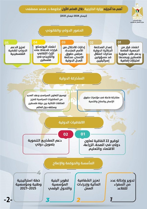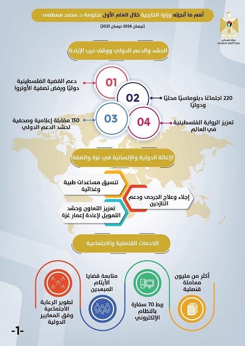 رام الله 3-5-2025 وفا- أصدر مركز الاتصال الحكومي، تقريرًا يسلّط الضوء على أهم تدخلات وزارة الخارجية والمغتربين وجهودها خلال العام الأول من تولي حكومة محمد مصطفى (نيسان 2024 – نيسان 2025)، وأهمية حراكها الدبلوماسي والوطني والإنساني في تعزيز الحضور الفلسطيني دوليًا، ومواجهة التحديات المتزايدة التي تمر بها القضية الفلسطينية، وفي مقدمتها حرب الإبادة المستمرة في قطاع غزة.