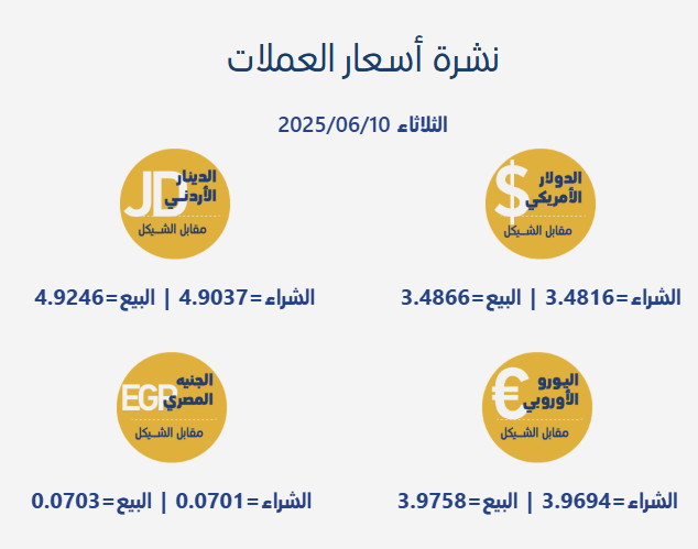 رام الله 10-6-2025 وفا- جاءت أسعار صرف العملات مقابل الشيقل الإسرائيلي، اليوم الثلاثاء، بحسب سلطة النقد الفلسطينية، على النحو التالي: