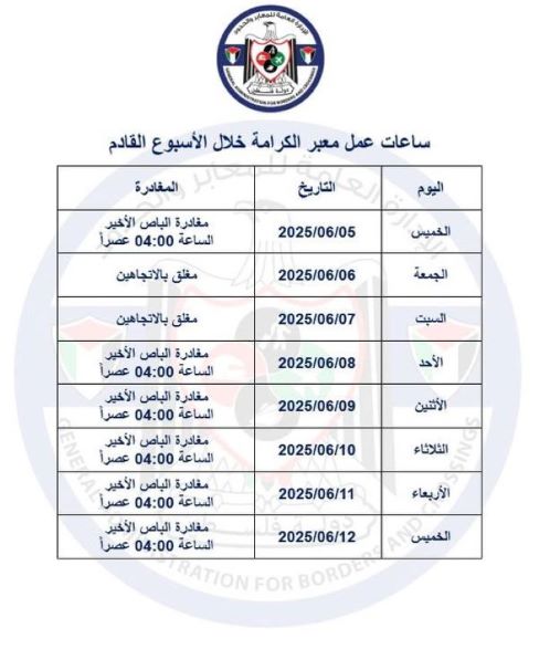 أريحا 2-6-2025 وفا- نوهت الهيئة المعابر والحدود الفلسطينية الى تعديل على ساعات عمل معبر الكرامة خلال عطلة عيد الأضحى المبارك لعام 2025، وذلك وفقاً للترتيبات التالية: