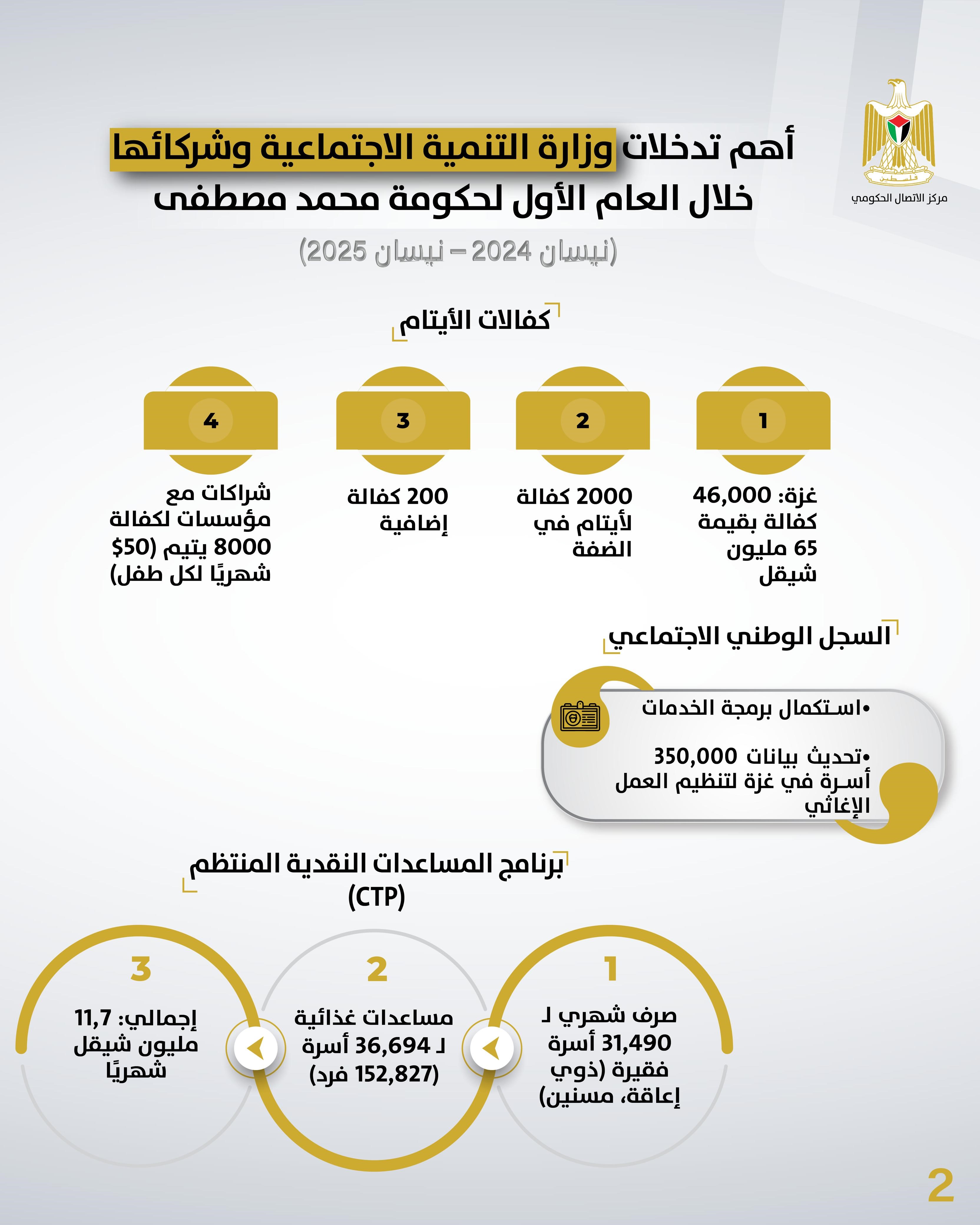 وبحسب تقرير مركز الاتصال الحكومي، وفقًا لبيانات وزارة التنمية الاجتماعية، فقد شكّلت الاستجابة السريعة للأزمة الإنسانية في قطاع غزة أولوية قصوى، إذ قدمت الوزارة مساعدات نقدية طارئة بقيمة 1000 شيقل لنحو 280 ألف أسرة نازحة ومتضررة من الحرب، تم تحويلها عبر المحافظ الإلكترونية، بمبلغ إجمالي بلغ 280 مليون شيقل، بدعم من مجموعة العمل النقدي.