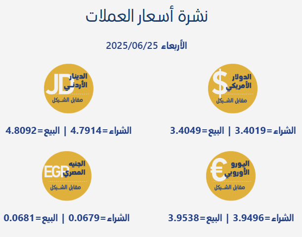 رام الله 25-6-2025 وفا- جاءت أسعار صرف العملات مقابل الشيقل الإسرائيلي، اليوم الأربعاء، بحسب سلطة النقد الفلسطينية، على النحو التالي: