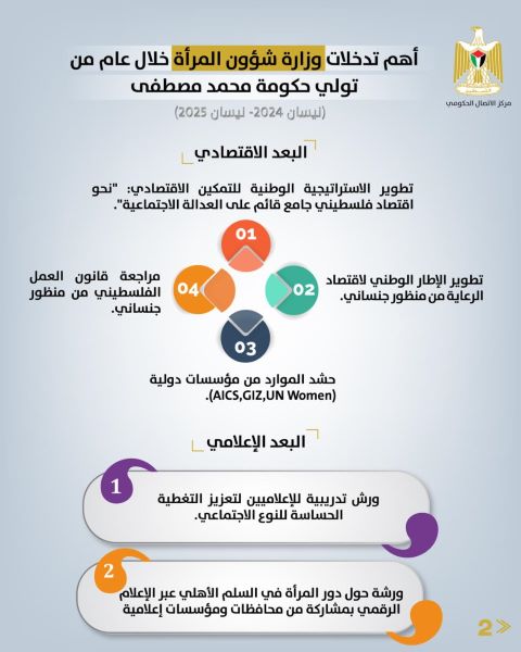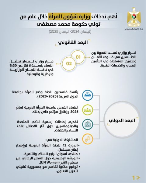 رام الله 25-6-2025 وفا- استعرض مركز الاتصال الحكومي، أهم تدخلات وزارة شؤون المرأة خلال العام الأول من تولي حكومة محمد مصطفى، في مجالات متعددة شملت الأبعاد القانونية والاقتصادية والاجتماعية والدولية والمؤسساتية والإعلامية، وذلك ضمن جهود متواصلة لتعزيز المساواة بين الجنسين، وتمكين المرأة الفلسطينية على المستويات كافة.