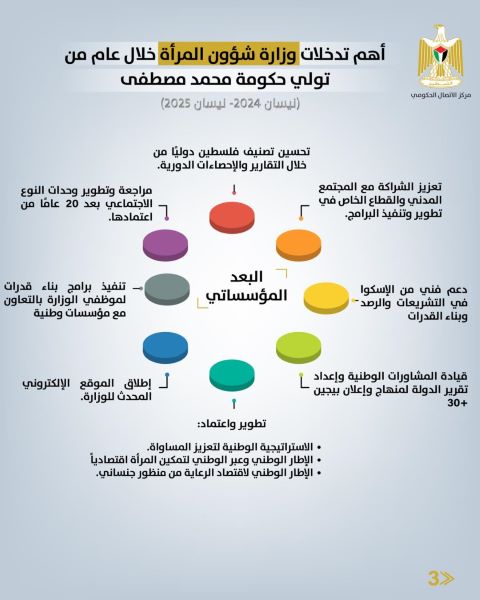وتأتي هذه الإنجازات ضمن رؤية شاملة تسعى إلى تعزيز حضور المرأة الفلسطينية في مختلف القطاعات، وتوفير بيئة قانونية واقتصادية واجتماعية تضمن مشاركتها الفاعلة على أساس من العدالة والمساواة.