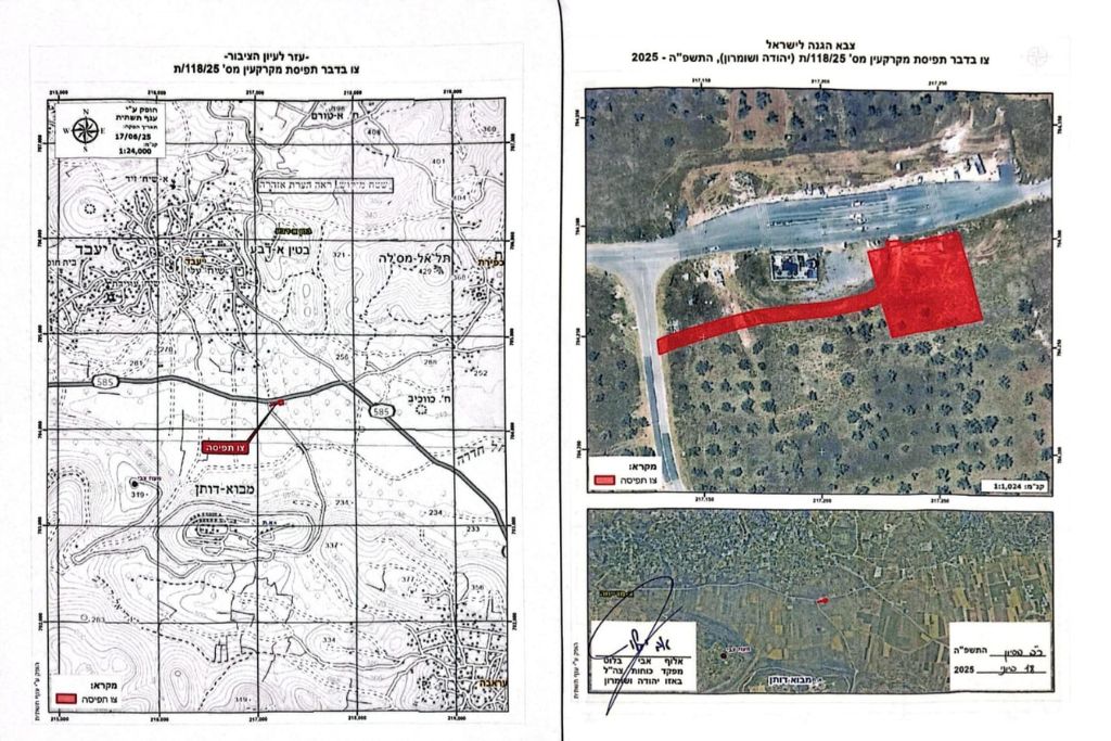 وأفادت بلدية يعبد لـ"وفا" بأن الاحتلال أخطر بالاستيلاء على أكثر من دونمين من أراضي البلدة لأغراض عسكرية احتلالية، وذلك بحسب مخطط هيكلي نشره.