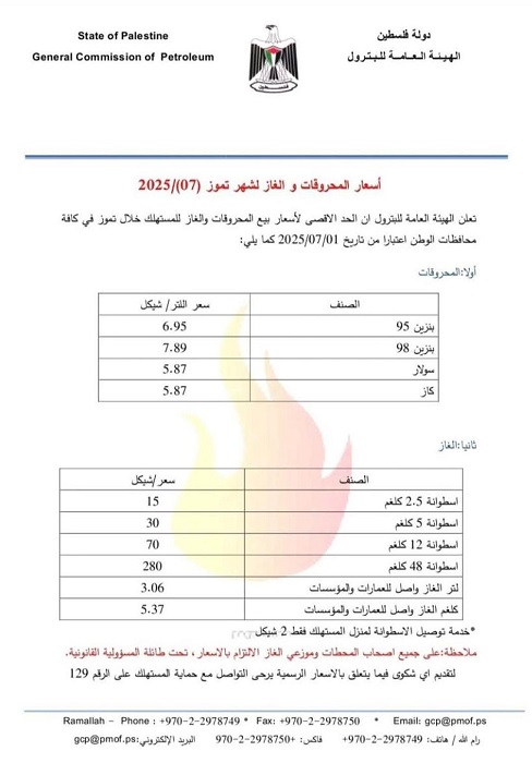 رام الله 30-6-2025 وفا- أعلنت الهيئة العامة للبترول، مساء اليوم الاثنين، أسعار المحروقات والغاز لشهر تموز (7/2025)، على النحو التالي: