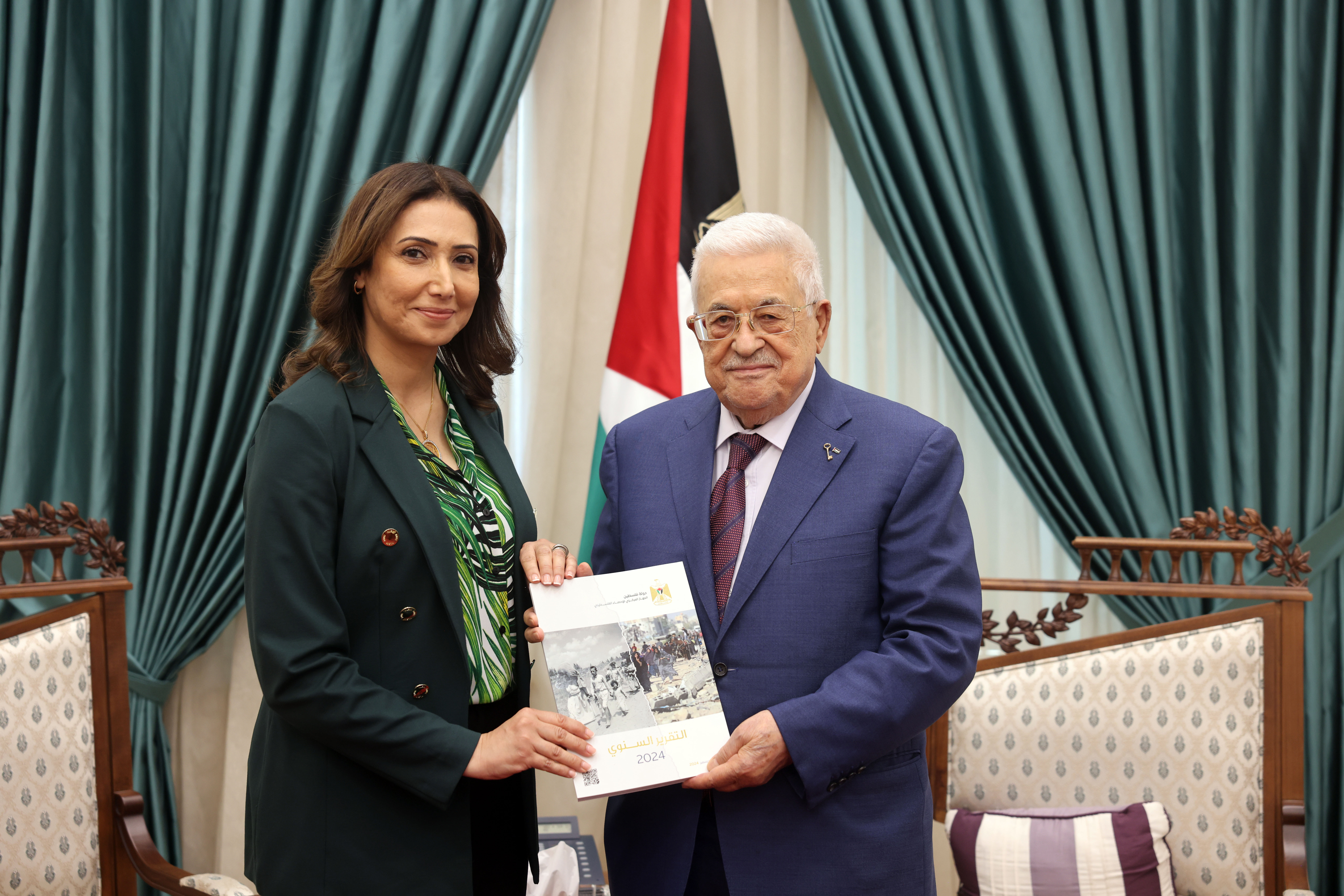 رام الله 4-6-2025 وفا- تسلم رئيس دولة فلسطين محمود عباس، اليوم الأربعاء، في مقر الرئاسة بمدينة رام الله، التقرير السنوي للجهاز المركزي للإحصاء الفلسطيني لعام 2024، وذلك خلال استقباله رئيسة جهاز الإحصاء علا عوض.