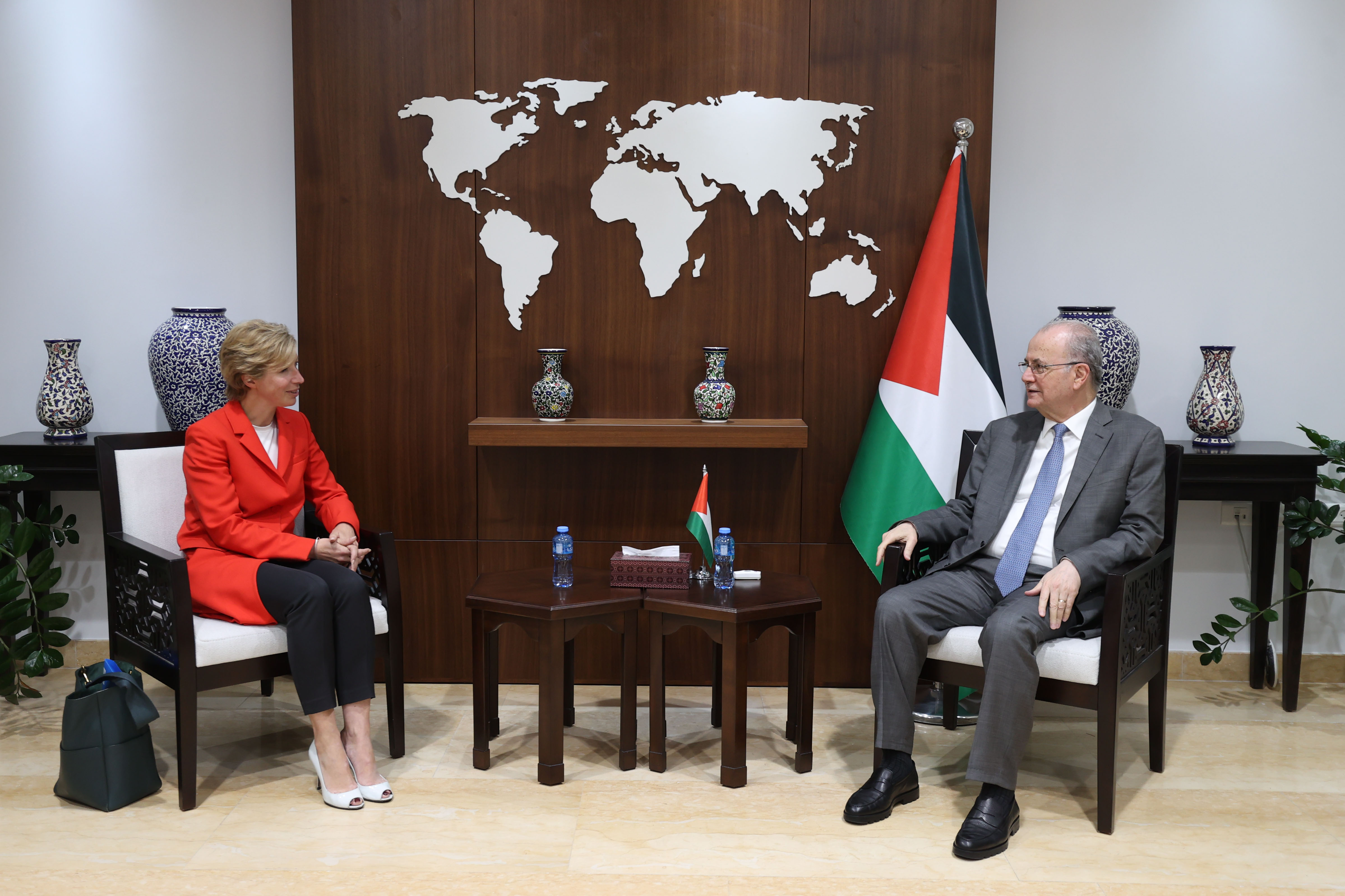 وأطلع مصطفى، ضيفته، على جهود غرفة العمليات الحكومية للتدخلات الطارئة في قطاع غزة، وعملها بالتنسيق مع المؤسسات الدولية والمحلية، داعيًا في الوقت ذاته إلى مزيد من التنسيق والعمل المشترك لدعم الحكومة الفلسطينية وبرامجها وخططها؛ والضغط الدولي للإفراج عن الأموال الفلسطينية المحتجزة لدى الاحتلال، ووقف كافة الاقتطاعات غير القانونية.