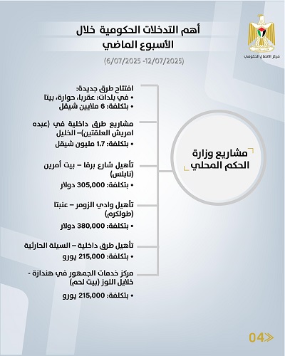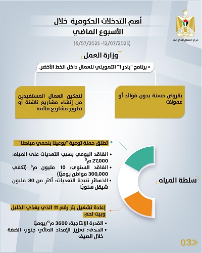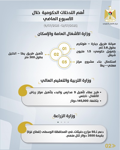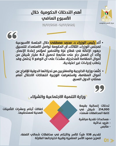 رام الله 13-7-2025 وفا- أصدر مركز الاتصال الحكومي، اليوم الأحد، تقريره الأسبوعي الذي يُظهِر أهم التدخلات التنموية والإصلاحية التي نفذتها الحكومة الفلسطينية، خلال فترة الأسبوع الماضي (06/07/2025–12/07/2025)، وهي على النحو الآتي: