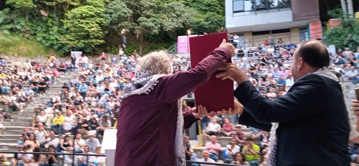 انطلاقا من منصّة مهرجان مديين الشعري الدولي في نسخته 35، وبحضور الشعراء المشاركين من دول العالم، وفي مطلعهم رئيس المهرجان، رئيس حركة الشعر العالمي الشاعر الكبير فرناندو ريندون، وتأسيسا على دعم شعراء العالم اللامحدود لفلسطين أرضا وشعبا وحقا، سيما في ظل الإبادة الجماعية والثقافية في غزة، فإننا، باسم الاتحاد العام للكتاب والأدباء الفلسطينيين، وبالتعاون مع مهرجان ميديين الدولي للشعر وبالشراكة مع حركة الشعر العالمية والتجمع الدولي لاتحادات الكتاب، نعلن، عن إطلاق جائزة فلسطين الدولية للشعر، والتي ستمنح لكتاب شعري أو يندرج في إطار الفن الشعري جسد معاناة فلسطين وشعبها، أو عبر عن رؤى مؤيدة لفلسطين وقضيتها العادلة، أو شكّل صوتاً رافعاً للحلم في مواجهة الظلام وللحرية في مواجهة الاحتلال".