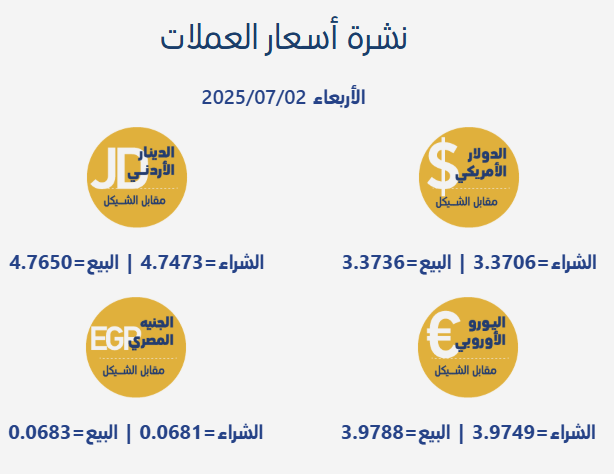 رام الله 2-7-2025 وفا- جاءت أسعار صرف العملات مقابل الشيقل الإسرائيلي، اليوم الأربعاء، بحسب سلطة النقد الفلسطينية، على النحو التالي: