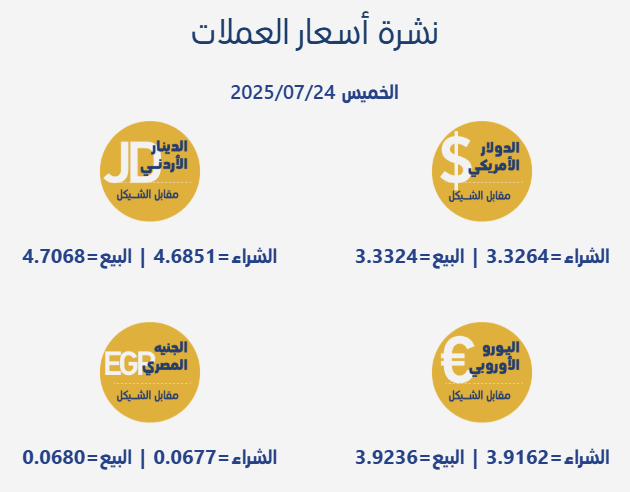 رام الله 24-7-2025 وفا- جاءت أسعار صرف العملات مقابل الشيقل الإسرائيلي، اليوم الخميس، بحسب سلطة النقد الفلسطينية، على النحو التالي: