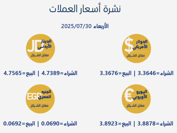 رام الله 30-7-2025 وفا- جاءت أسعار صرف العملات مقابل الشيقل الإسرائيلي، اليوم الأربعاء، بحسب سلطة النقد الفلسطينية، على النحو التالي: