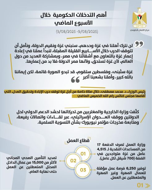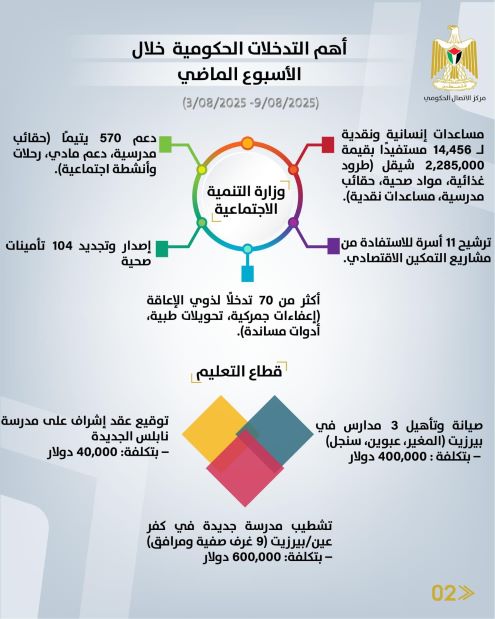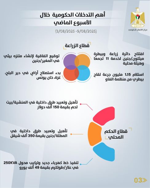 رام الله 10-8-2025 وفا- أصدر مركز الاتصال الحكومي، اليوم الأحد، تقريرًا يُبرز أهم التدخلات التنموية والإصلاحية التي نفذَّتها الحكومة الفلسطينية، خلال الأسبوع الماضي (03/08/2025 – 09/08/2025)، وهي على النحو الآتي: