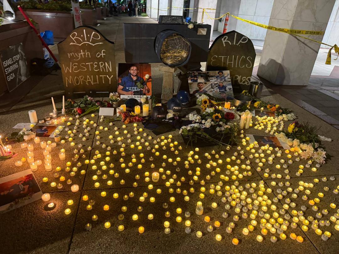 واشنطن 12-8-2025 وفا- نظم ناشطون وأفراد من المجتمع المحلي وكوادر صحفية، وقفة شموع أمام مقار قنوات إخبارية كبرى في العاصمة الأميركية واشنطن، شملت FOX News وNBC News وCSPAN Studio، تكريمًا للصحفيين الستة الذين استشهدوا قبل يومين جراء غارات الاحتلال على قطاع غزة.