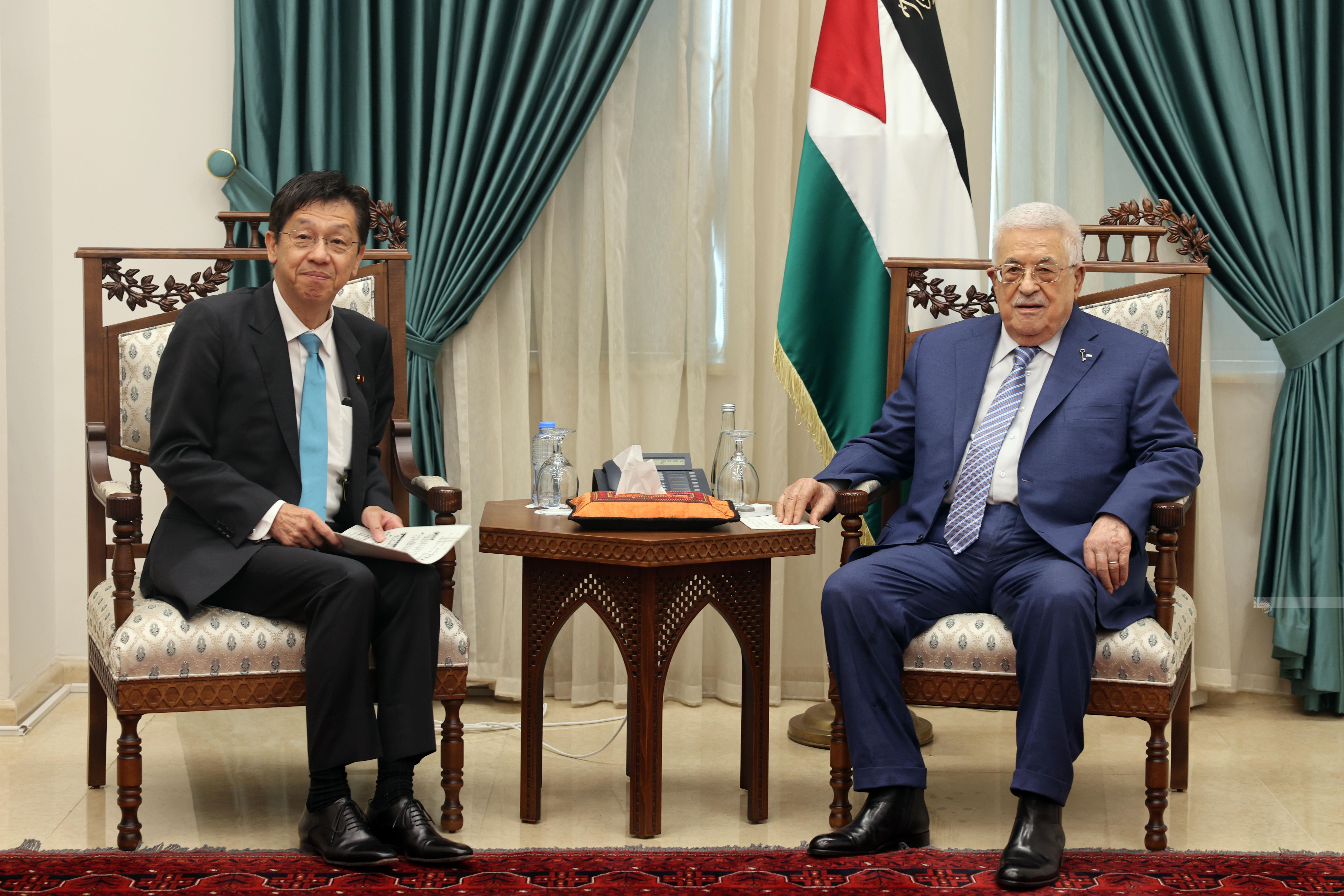 رام الله 14-8-2025 وفا- استقبل رئيس دولة فلسطين محمود عباس، اليوم الخميس، بمقر الرئاسة في مدينة رام الله، نائب وزير الخارجية الياباني البرلماني  ماتسوموتو هيساشي.