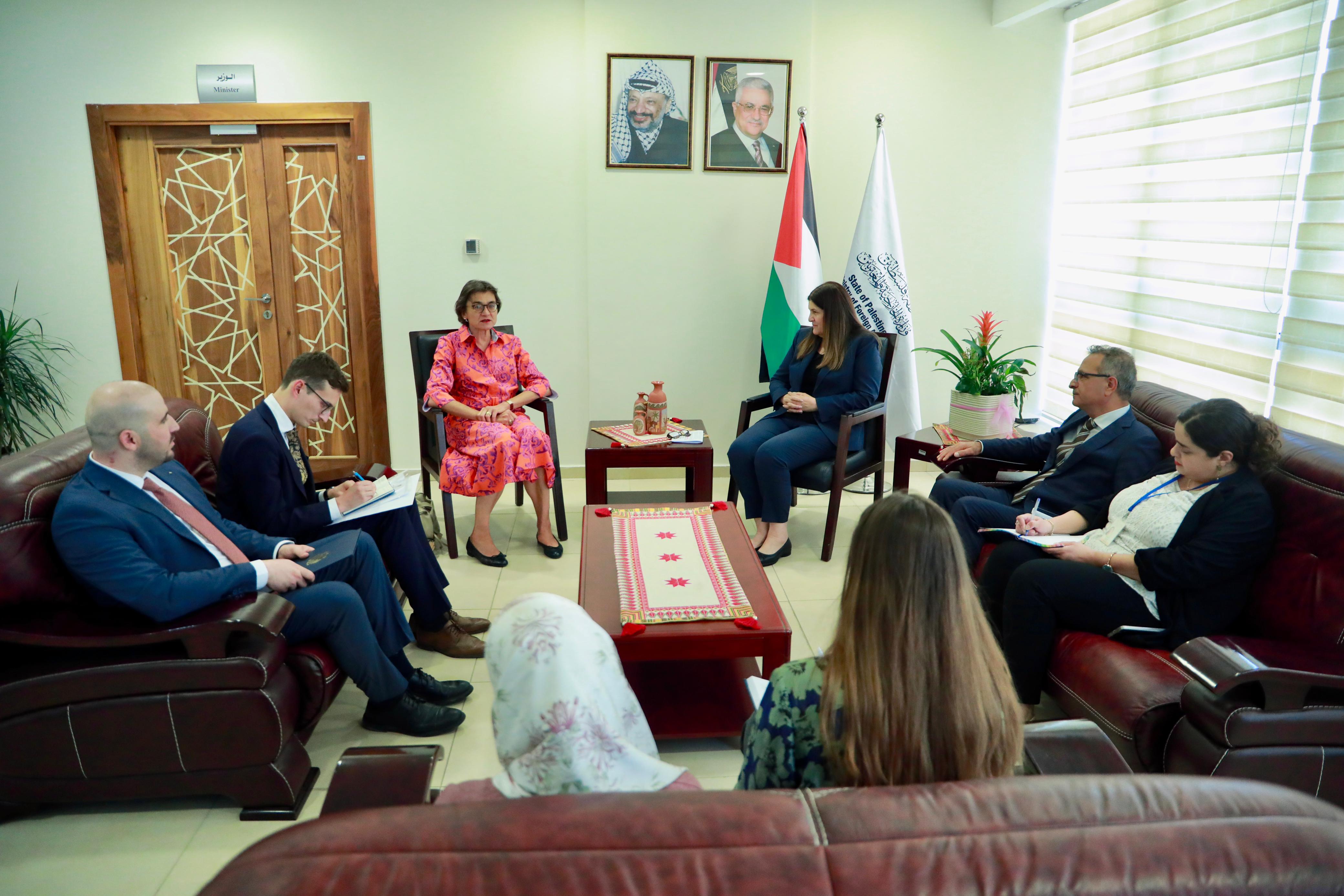 من جانبها، أكدت شليم التزام بلادها بمواصلة دعم حقوق الشعب الفلسطيني، وتعزيز فرص السلام، وضرورة تعزيز العلاقات الثنائية وتوسيع آفاق التعاون.