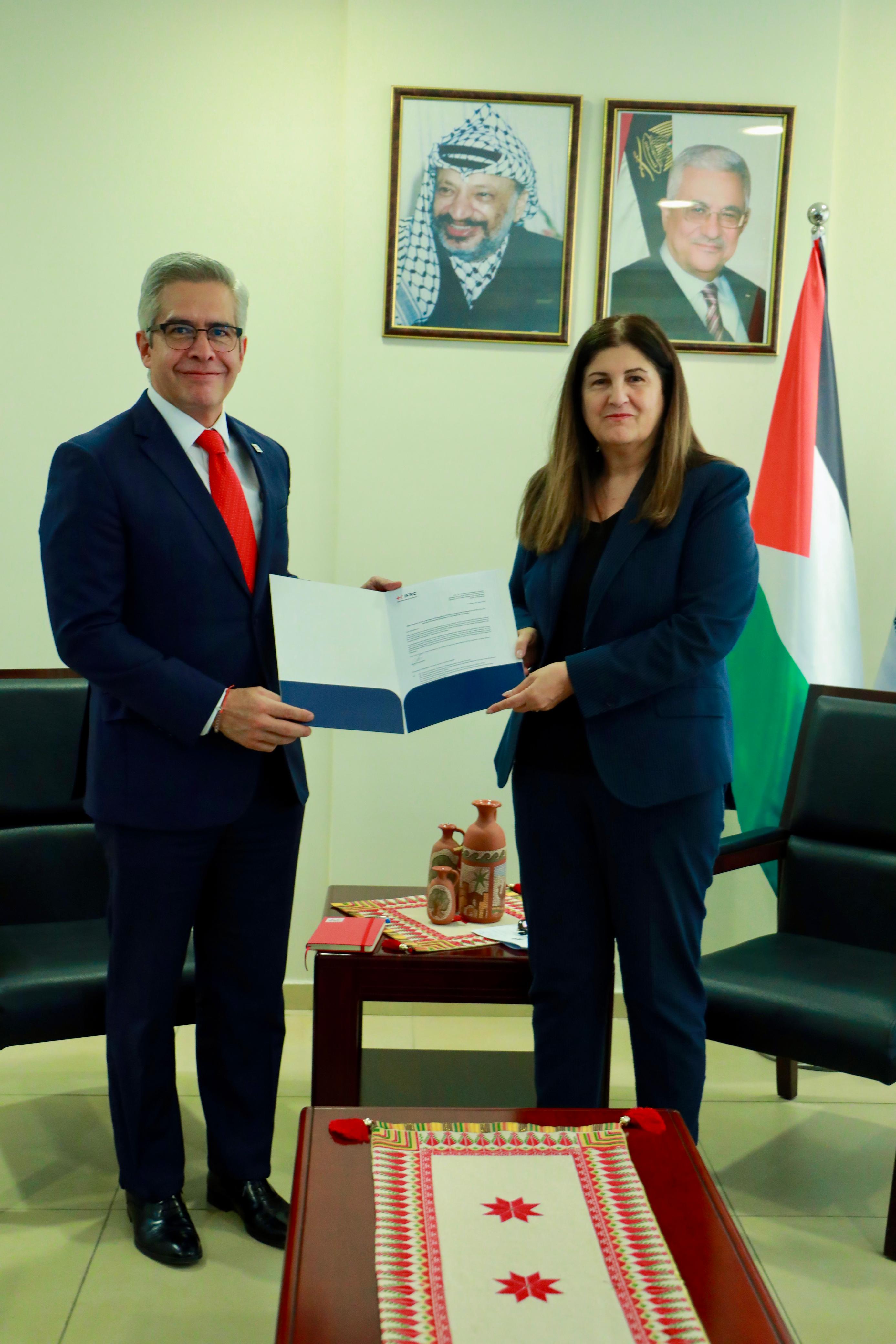 رام الله 14-8-2025 وفا- تسلمت وزيرة الخارجية والمغتربين فارسين شاهين، اليوم الخميس، أوراق اعتماد رئيس اتحاد جمعيات الصليب والهلال الأحمر (IFRC) الجديد لدى فلسطين خوسيه دانيل.