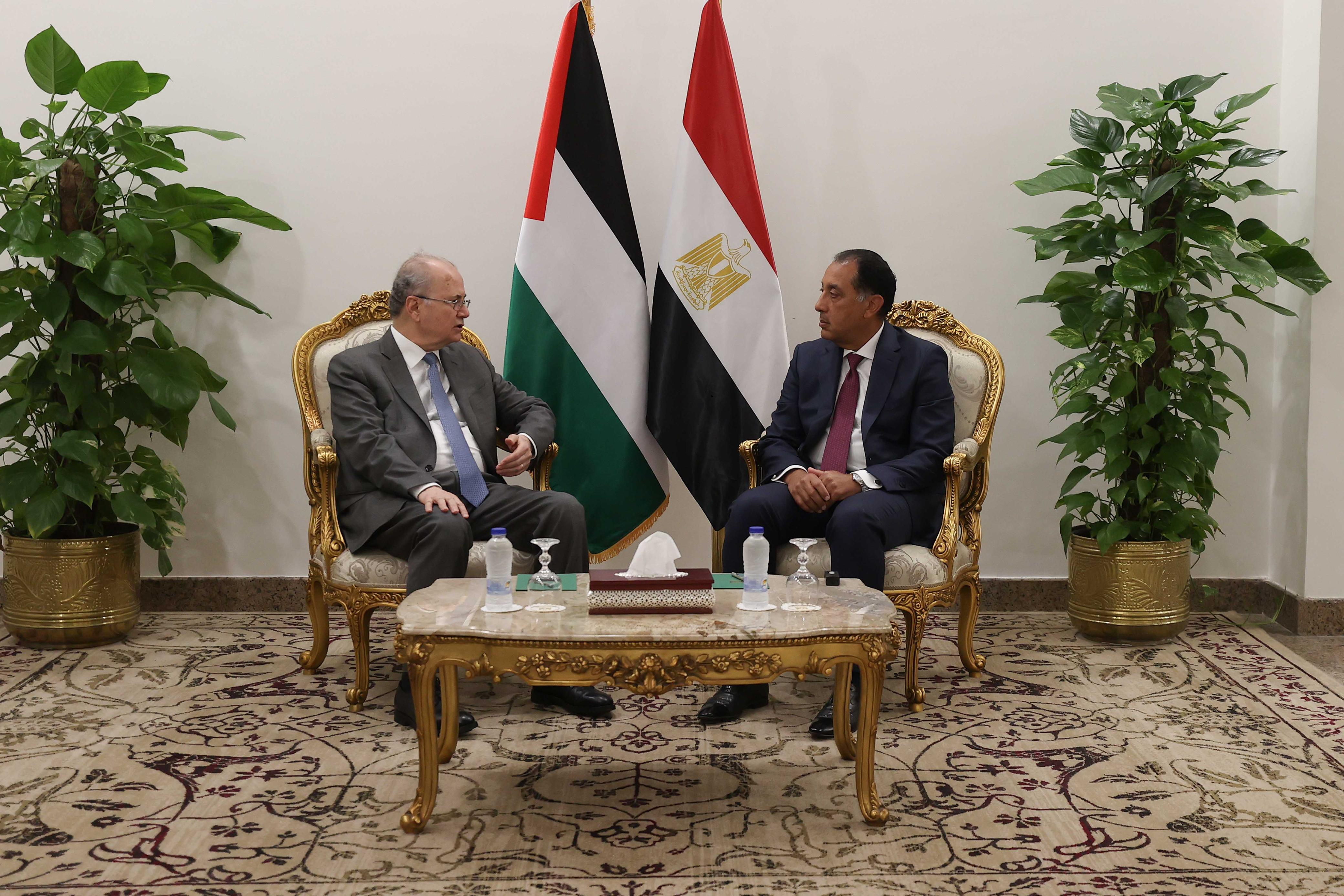 من جانبه، نقل رئيس الوزراء المصري تحيات الرئيس عبد الفتاح السيسي لأخيه الرئيس محمود عباس وللحكومة والشعب الفلسطيني، مؤكدا على موقف بلاده الثابت الداعم للقضية الفلسطينية على كافة الأصعدة وفي كافة المحافل الدولية، واستمرار بذل بلاده كافة الجهود مع الشركاء الدوليين والدول الصديقة من أجل التوصل لوقف إطلاق نار دائم ومستدام، واستعداد مصر لعقد مؤتمر إعادة الإعمار فور وقف العدوان.