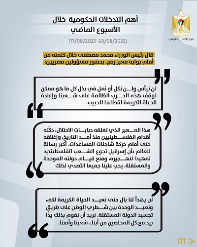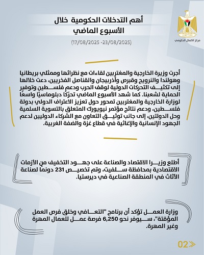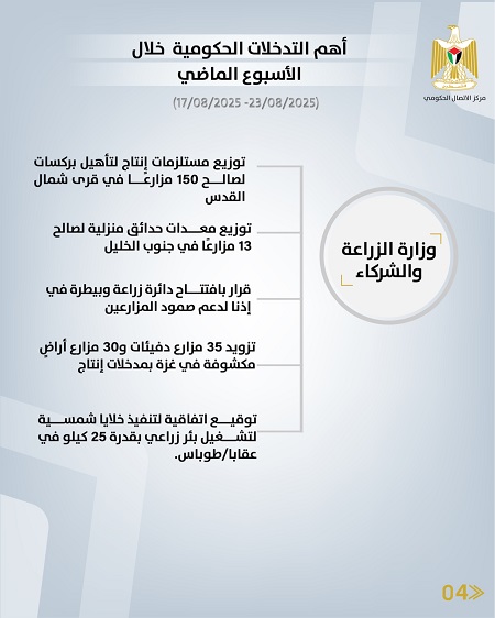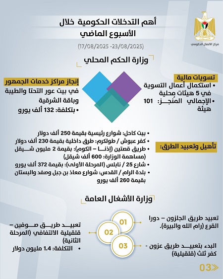 رام الله 24-8-2025 وفا- أصدر مركز الاتصال الحكومي تقريرا يبرز أهم التدخلات التنموية والإصلاحية التي نفذَّتها الحكومة الفلسطينية، خلال الأسبوع الماضي (17/08/2025 – 23/08/2025)، وهي على النحو الآتي: