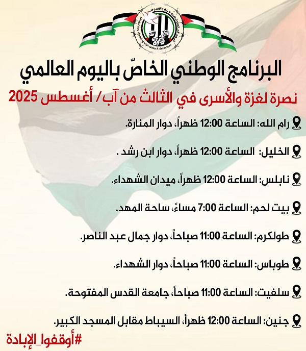 رام الله 3-8-2025 وفا- يحيي أبناء شعبنا في الوطن والشتات، اليوم الأحد، اليوم الوطني والعالمي نصرة لغزة والأسرى، ورفضا للإبادة الجماعية، وجريمة التجويع، والاستعمار، وسياسات التهجير القسري، وللتصدي للعدوان المتواصل على شعبنا الفلسطيني في كل أماكن وجوده.