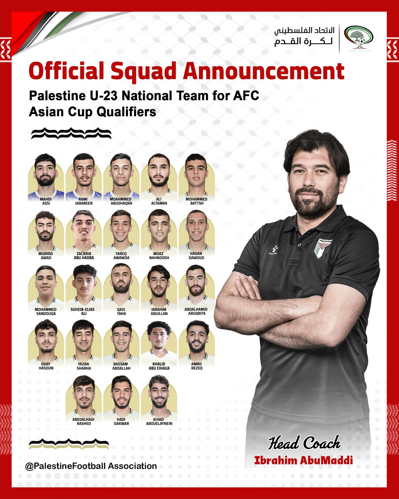 القدس 30-8-2025 وفا- أعلن الجهاز الفني لمنتخبنا الوطني الأولمبي لكرة القدم بقيادة المدرب إبراهيم أبو ماضي، عن القائمة النهائية المكوّنة من 23 لاعباً للمشاركة في التصفيات المؤهلة إلى نهائيات كأس آسيا 2026 تحت 23 عاماً.