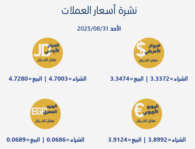 رام الله 31-8-2025 وفا- جاءت أسعار صرف العملات مقابل الشيقل الإسرائيلي، اليوم الأحد، بحسب سلطة النقد الفلسطينية، على النحو التالي: