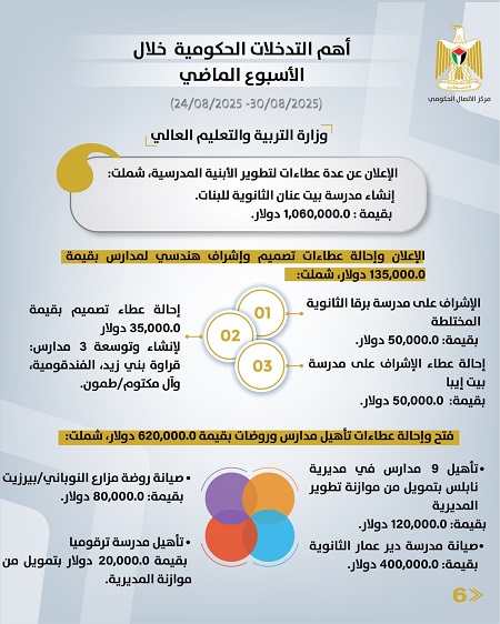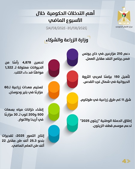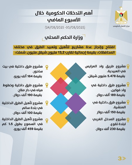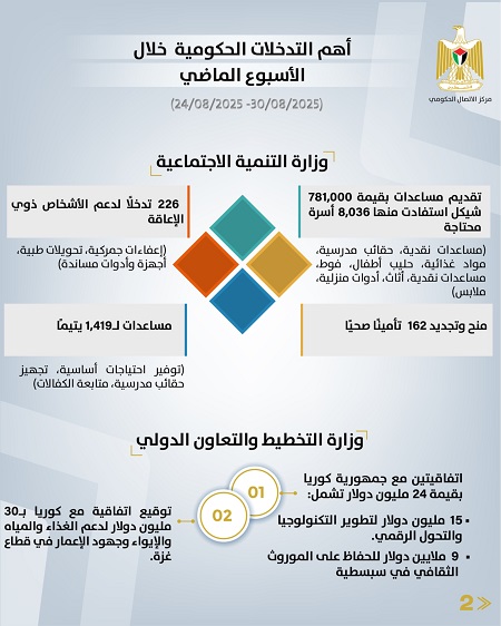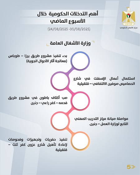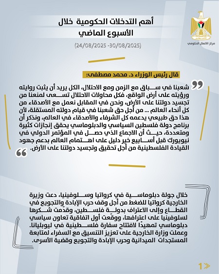 رام الله 31-8-2025 وفا- أصدر مركز الاتصال الحكومي تقريرا يُبرز أهم التدخلات التنموية والإصلاحية التي نَفَّذَتها الحكومة الفلسطينية، خلال الأسبوع الماضي (24/08/2025 – 30/08/2025)، وهي على النحو الآتي:
