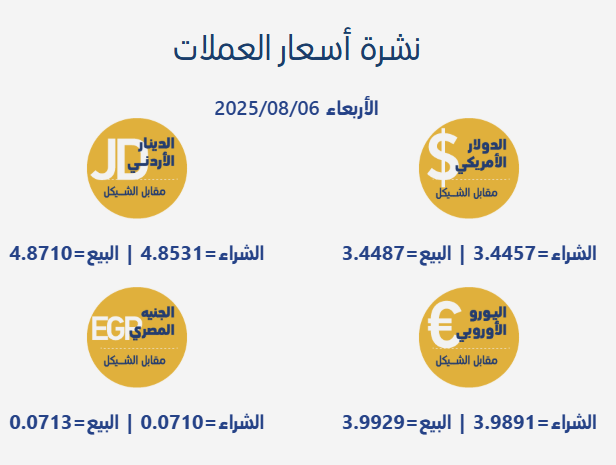 رام الله 6-8-2025 وفا- جاءت أسعار صرف العملات مقابل الشيقل الإسرائيلي، اليوم الأربعاء، بحسب سلطة النقد الفلسطينية، على النحو التالي: