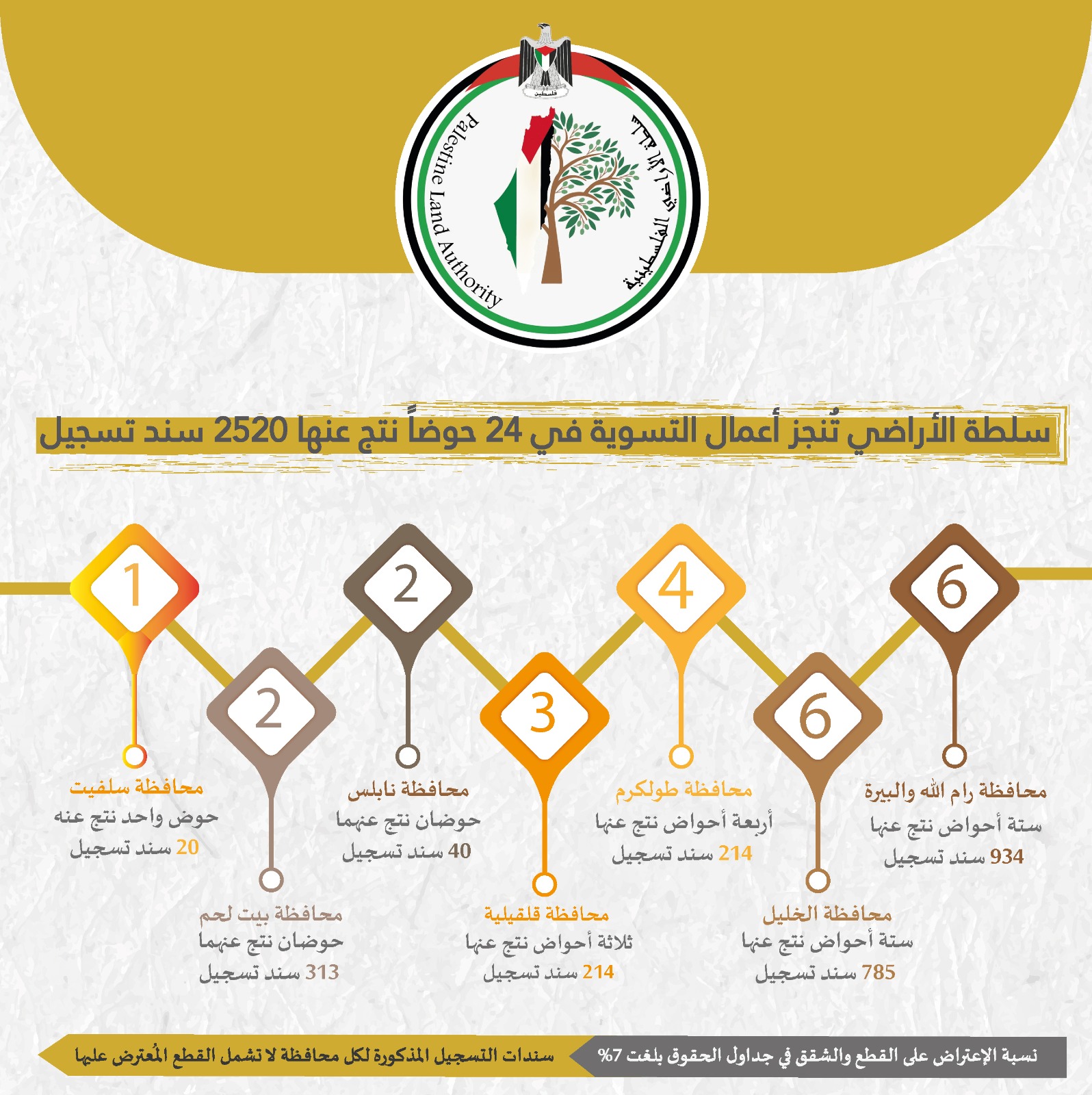 وأكدت سلطة الأراضي، أن هذه الإنجازات الوطنية بجهود موظفيها وكوادرها تأتي ضمن رؤيتها لاستكمال مشروع التسوية باعتباره مشروعا وطنيا واستراتيجيا لحماية الأرض وصون الحقوق للأجيال القادمة.