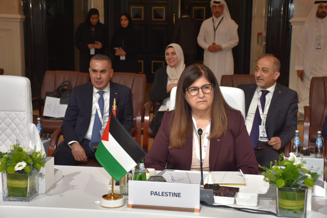 ويمثل دولة فلسطين في الاجتماع التحضيري، وزيرة الخارجية والمغتربين فارسين شاهين، وسفير دولة فلسطين لدى قطر فايز أبو الرب، ومندوب دولة فلسطين بالجامعة العربية السفير مهند العكلوك.