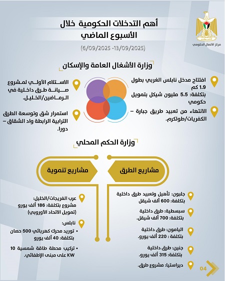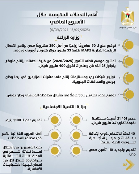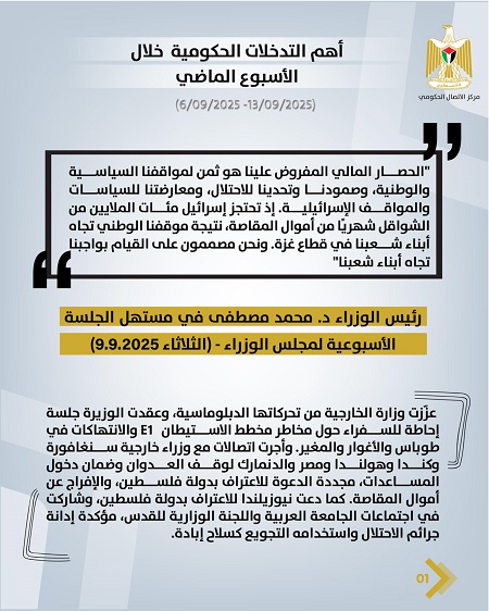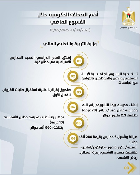 رام الله 14-9-2025 وفا- أصدر مركز الاتصال الحكومي تقريرا يبرز أهم التدخلات التنموية والإصلاحية التي نفذَّتها الحكومة الفلسطينية، خلال الأسبوع الماضي (07/09/2025 – 13/09/2025)، وهي على النحو الآتي: