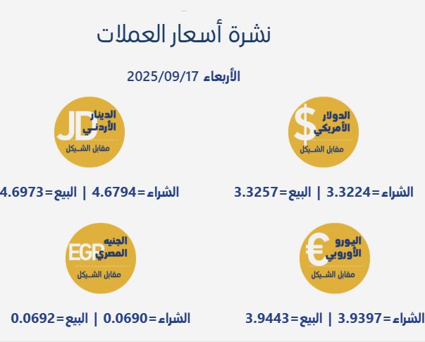 رام الله 17-9-2025 وفا- جاءت أسعار صرف العملات مقابل الشيقل الإسرائيلي، اليوم الأربعاء، بحسب سلطة النقد الفلسطينية، على النحو التالي: