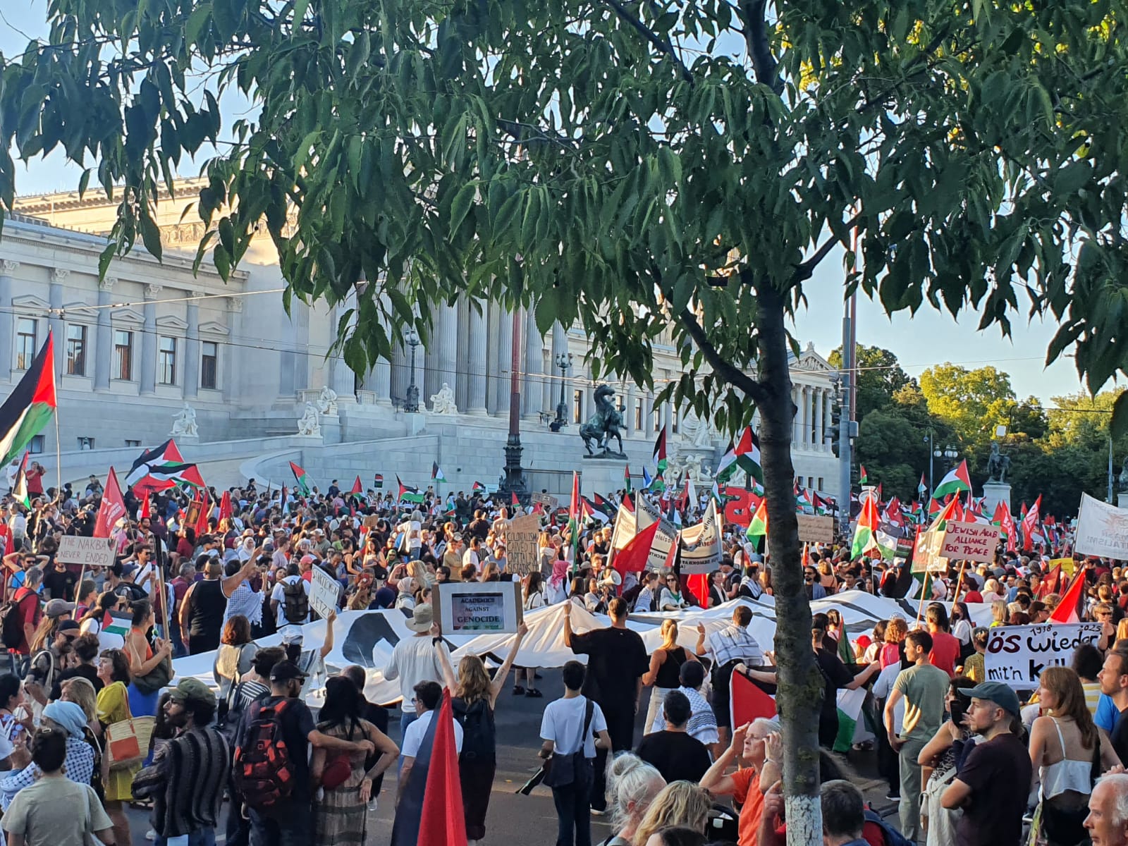 وبدأت الفعالية بجملة من الكلمات أمام ساحة "كريستيان برودا"، وانطلقت التظاهرة باتجاه شارع "ماريا هيلفر" الشهير، وصولًا إلى البرلمان النمساوي، حيث اختتمت الفعالية، بمشاركة عشرات الآلاف من المتظاهرين، رافعين العلم الفلسطيني ولافتات تعبّر عن رفض الحرب على غزة، وتدين الإبادة الجماعية بحق الشعب الفلسطيني، وتطالب بإنهاء الاحتلال وتحقيق الحرية والاستقلال والاعتراف بالدولة الفلسطينية.