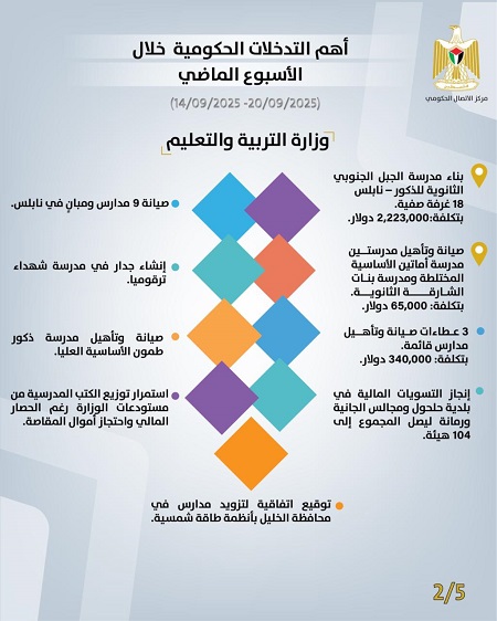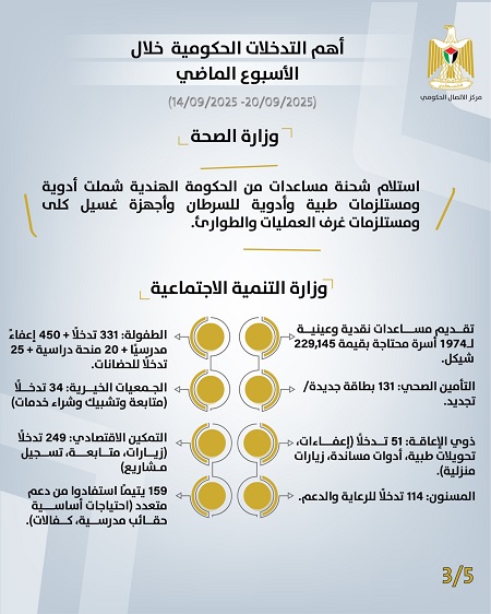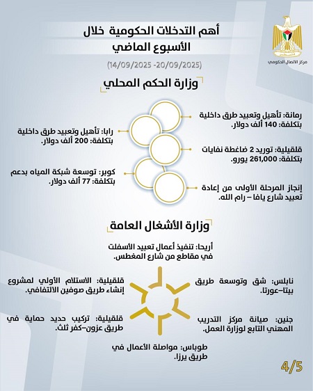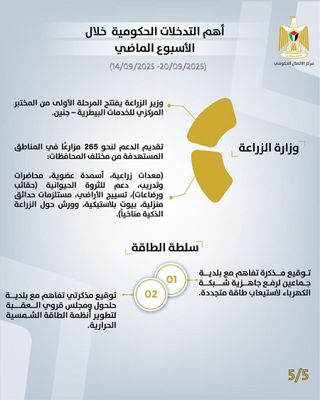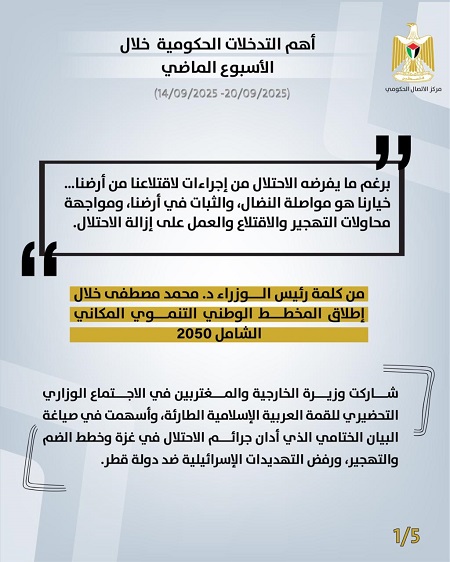 رام الله 21-9-2025 وفا- أصدر مركز الاتصال الحكومي تقريرًا يُبرز أهم التدخلات التنموية والإصلاحية التي نَفَّذَتها الحكومة الفلسطينية، خلال الأسبوع الماضي (14/09/2025 – 20/09/2025)، وهي على النحو الآتي: