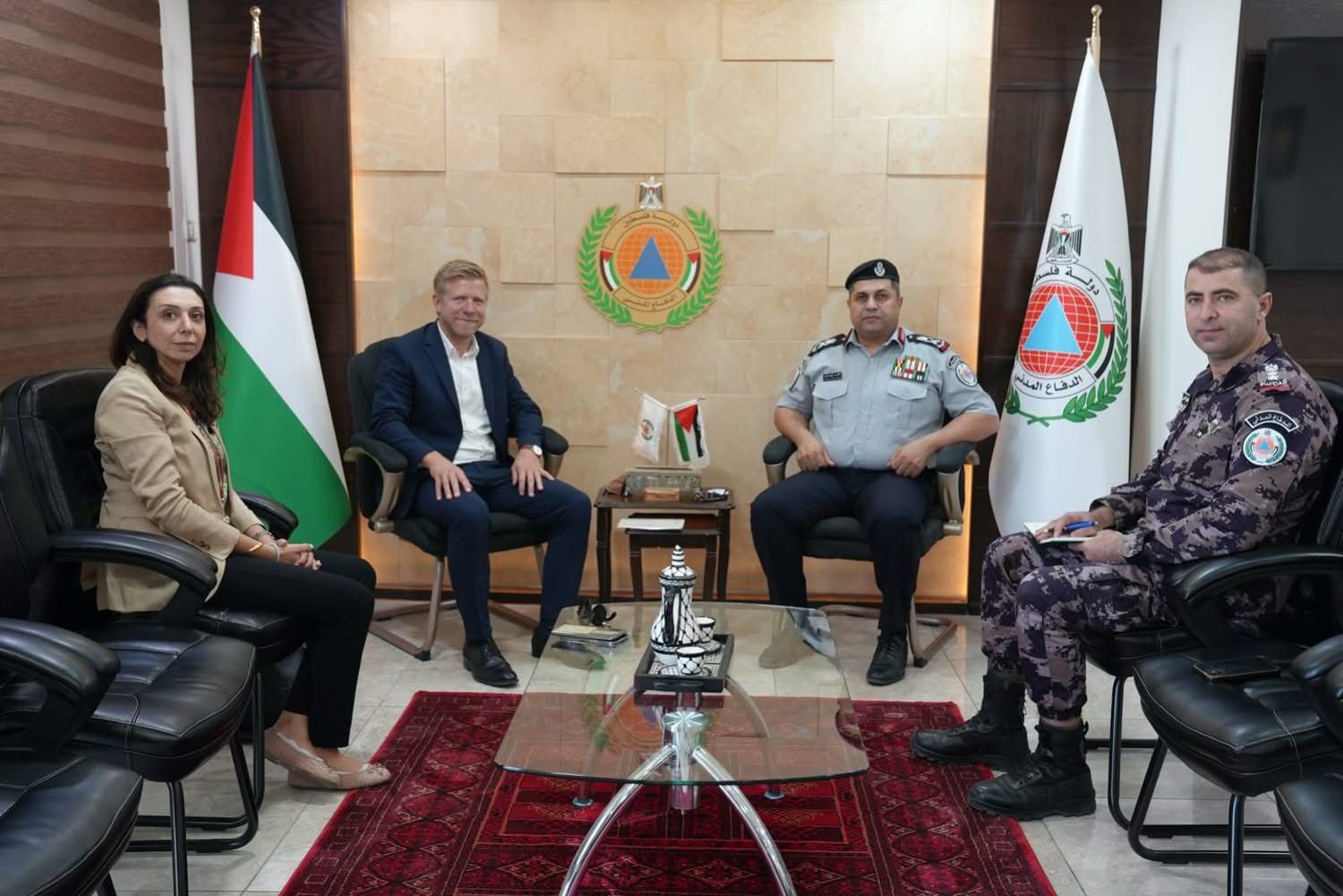 رام الله 23-9-2025 وفا- بحث مدير عام الدفاع المدني اللواء ركن أكرم ثوابتة، اليوم الثلاثاء، ومدير قطاع الحوكمة في الوكالة الألمانية للتعاون الدولي "Giz" يانس ونائبته دينا الحصري، آليات تعزيز التعاون في مجالات التدريب، وتبادل الخبرات، وتطوير البرامج المشتركة التي تهدف إلى دعم وتعزيز قدرة الدفاع المدني في مواجهة التحديات المتزايدة في مجال الطوارئ والكوارث.